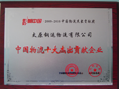 2010年6月24日,我公司在“第四屆中國(guó)(蘇州)國(guó)際物流與供應(yīng)鏈合作發(fā)展高峰論壇"暨"影響中國(guó)2009--2010中國(guó)物流杰出貢獻(xiàn)獎(jiǎng)"表彰活動(dòng),被授予“中國(guó)物流十大杰出貢獻(xiàn)企業(yè)”榮譽(yù)稱號(hào)。