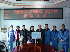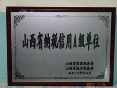 2011年1月25日,我公司榮獲省國稅、地稅聯(lián)合頒發(fā)的“山西省納稅信用A級單位”榮譽(yù)稱號。