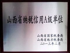 2013年6月14日,我公司榮獲省國稅、地稅聯(lián)合頒發(fā)的“山西省納稅信用A級單位”榮譽(yù)稱號。