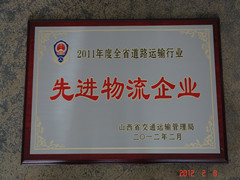 2012年2月8日,在山西省道路運(yùn)輸工作會議上,我公司獲得由山西省交通運(yùn)輸管理局頒發(fā)的2011年度全省道路運(yùn)輸行業(yè)《先進(jìn)物流企業(yè)》榮譽(yù)稱號。